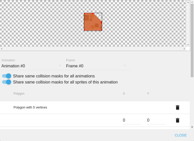 This will take you to the screen where you can enter/drag the outline of your collision mask. To add more points, click on the + sign below all the coordinates of your points. My final sprite collision masks look as shown below.